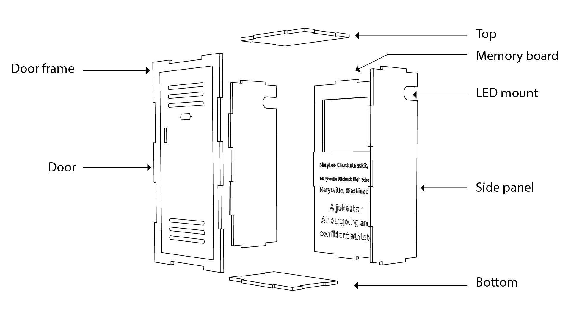 Twelve feet wide by nine feet tall, this interactive memorial recalls 226 lives that were unjustly taken in school shootings. Arranged in the shape of a handgun, each person is represented by a locker, which can be opened, revealing the story of a life no longer with us.
